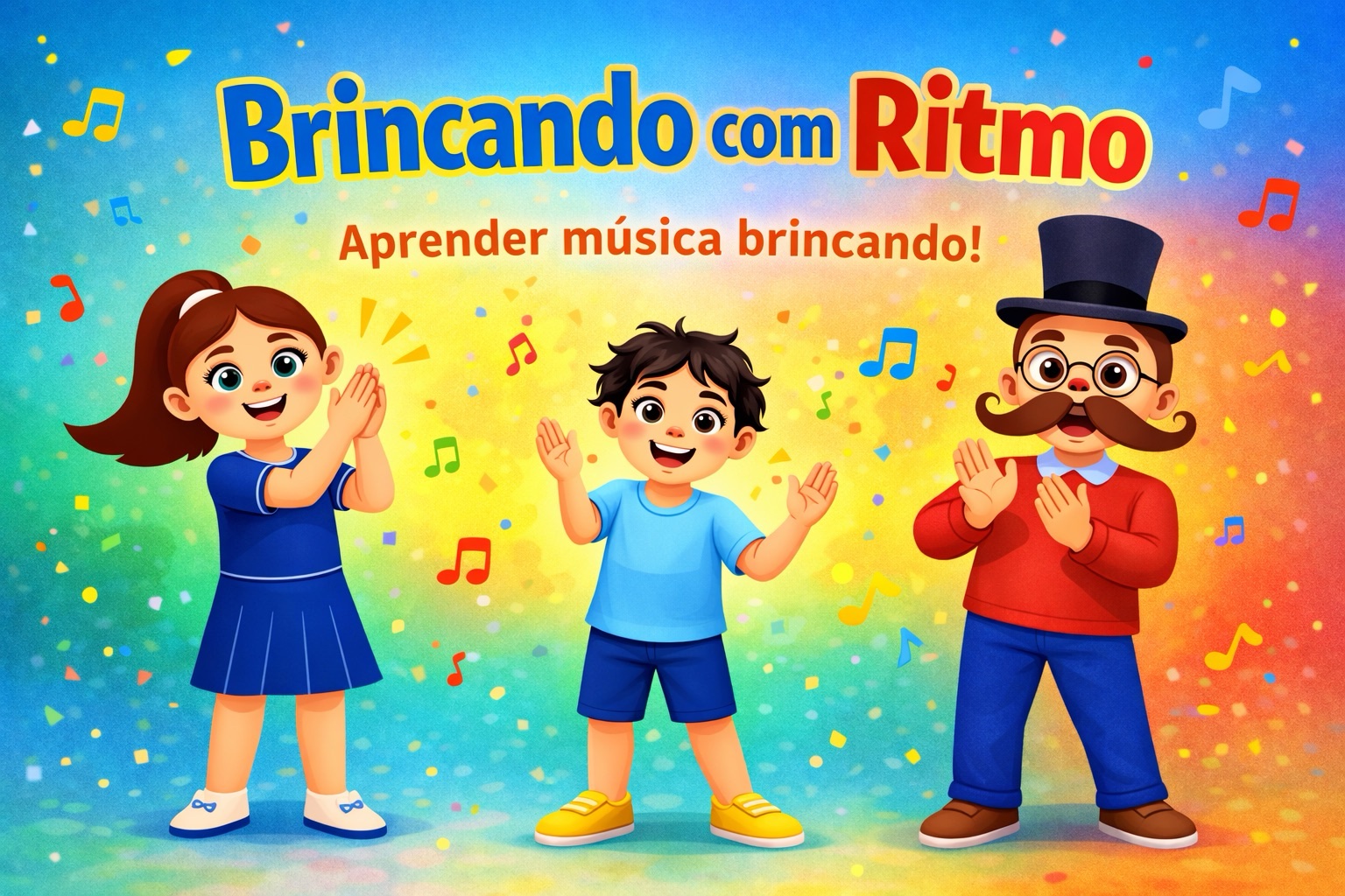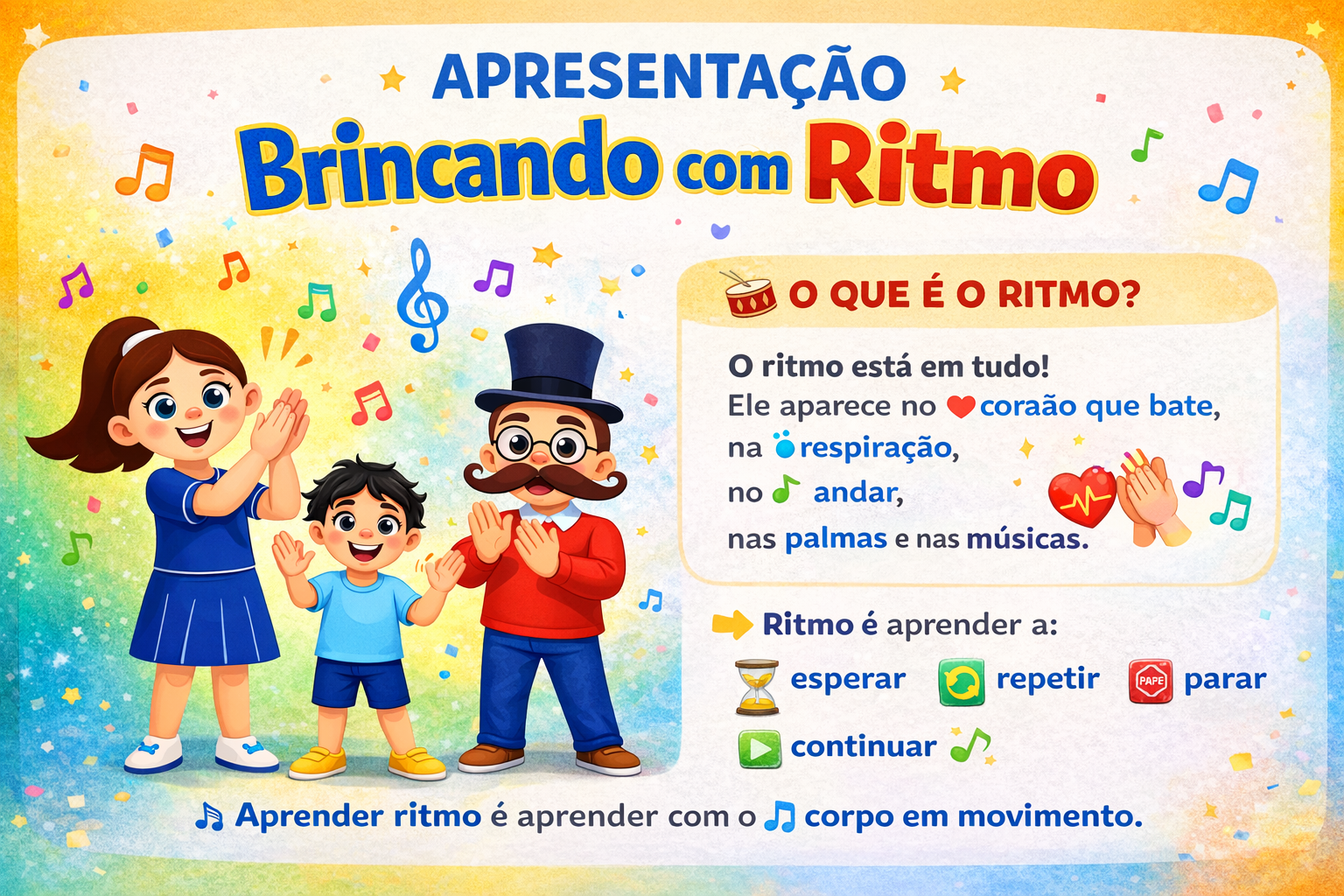 Brincando com Ritmo é um jogo musical divertido em que as crianças exploram o corpo, a escuta e o movimento para acompanhar diferentes ritmos da música. Por meio de palmas, gestos e mímicas, elas aprendem a perceber o tempo musical, a velocidade e as pausas, tudo de forma natural e brincante.